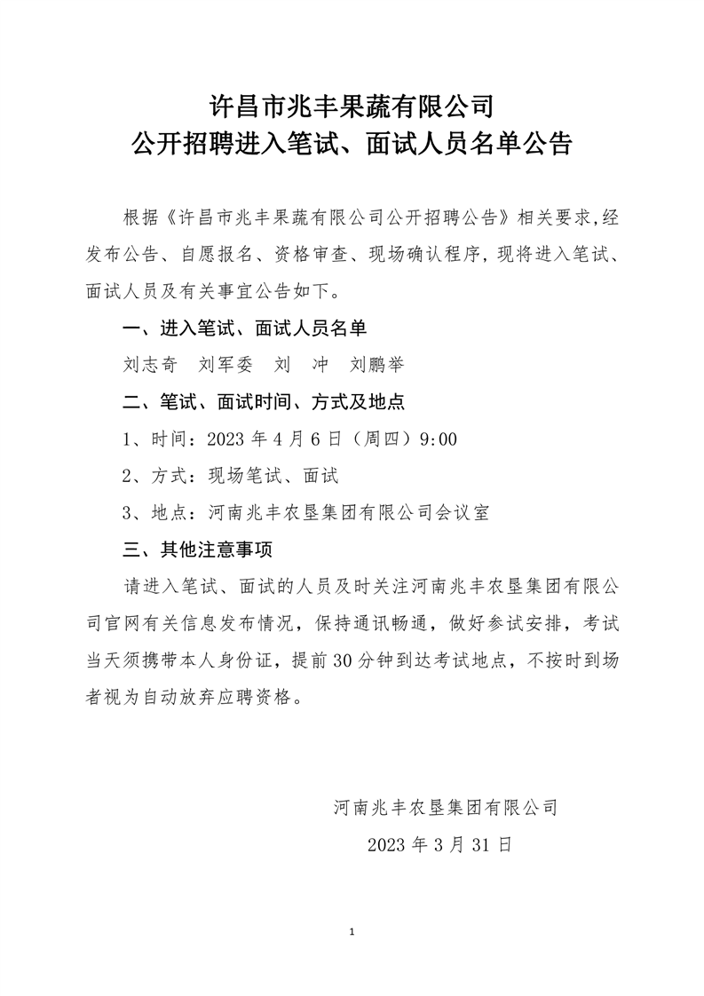 · 許昌市兆豐果蔬有限公司 公開(kāi)招聘進(jìn)入筆試、面試人員名單公告